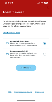 In diesem Schritt müssen Sie sich identifizieren. Sie können sich mit Ihrer elektronischen Gesundheitskarte (eGK) oder Ihrem Personalausweis (eID) identifizieren. Entscheiden Sie sich für eine Methode und klicken Sie auf die Schaltfläche "Identifizieren".